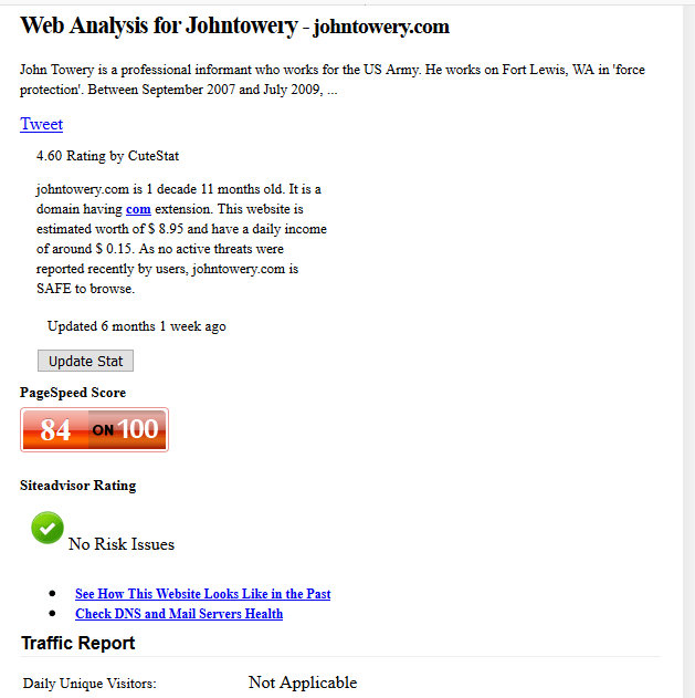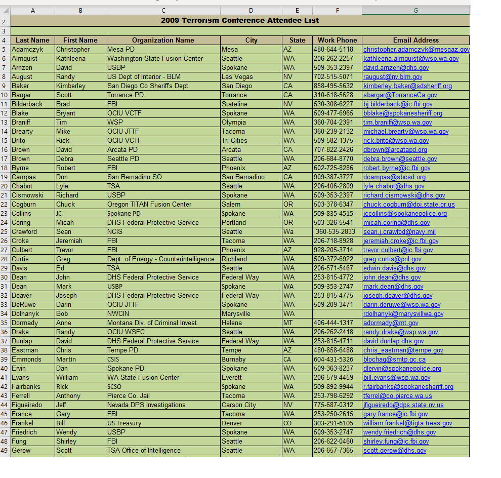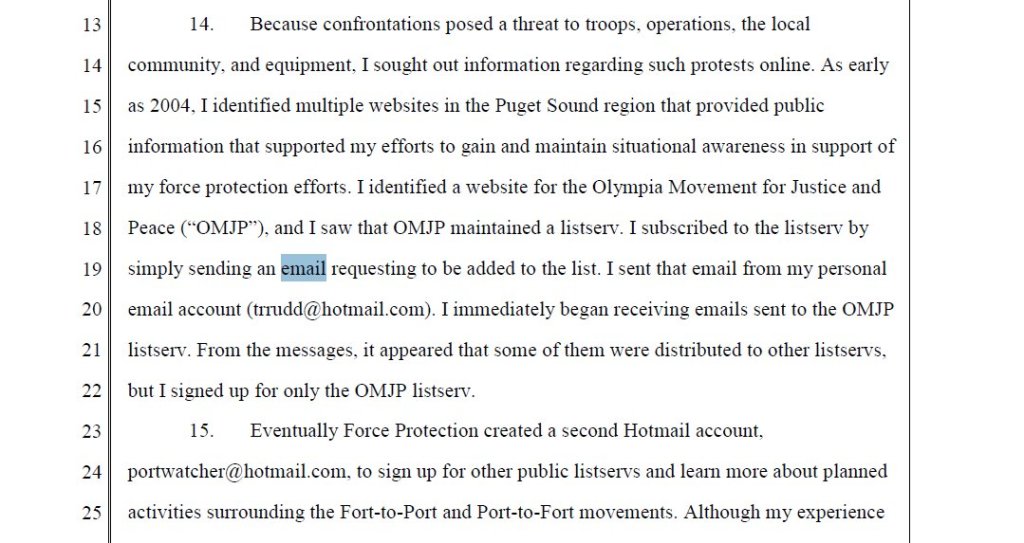 Because so many Oly PMR defendants were representing themselves in court, an email list on Riseup.net was set up in October 2006 to share information between the defendants. The US Army Force Protection Agent, John J Towery, later joined this Oly22 defendants’ listserv on February 16, 2007 using the email address ‘jaamt004@gmail.com’. The letters in the email ‘name’ later turned out to be the first initials of the members of his family, followed by the initial of their last name and the number of persons in their family. We suspect that he used this email privately as well, since it still existed to the day of this writing. We also think he should change his password more often, but we digress…