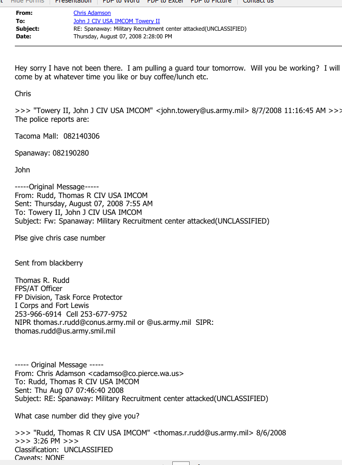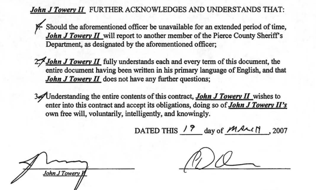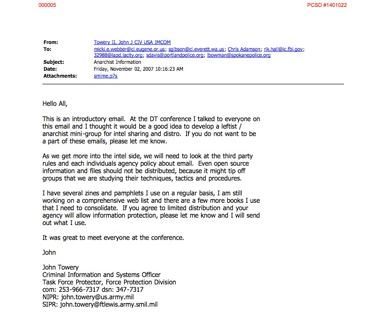 Documents received later from the City of Tacoma revealed that John J Towery signed a confidential source agreement with Pierce County Sheriff’s Detective Sergeant Chris Adamson on March 19, 2007. For the next several years, this document would “excuse” Towery’s infiltration of Olympia and Tacoma activist circles despite his US Army employment. http://cryptome.org/0003/towery-spy1.zip (this copy was redacted by the victims of this release – see pages 8 – 11)