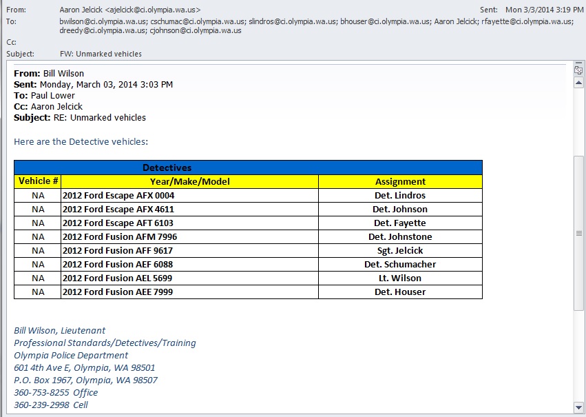 As soon as John Towery had been named and identified with Fort Lewis Force Protection, I removed him from access to the Olympia PMR listserv and began working on confirming his vehicles at the listed address I had obtained from the Voter records of Pierce County. This effort would take most of the next 4 weeks, and involve photos at his house (of his car in the driveway) and in Olympia, where we shot photos of his face and his motorcycle. The motorcycle ended up being linked online to his name through his motorcycle club, the “Iron Butt Association” which we found through observing a license plate holder on that vehicle. Within a week of securing proofs of his identity I announced the news at an Olympia City Council meeting on July 21, 2009. The next day, the news was posted on open web sites Portland and Seattle Indymedia, as well as Olyblog.net and assorted news sources online such as Tacoma SDS. Of course the news also went out on all of the activist listservs active at the time: OMJP, OlyPMR, NWAIDAC, SDS, etc.