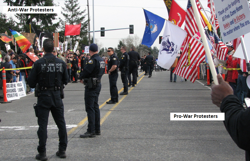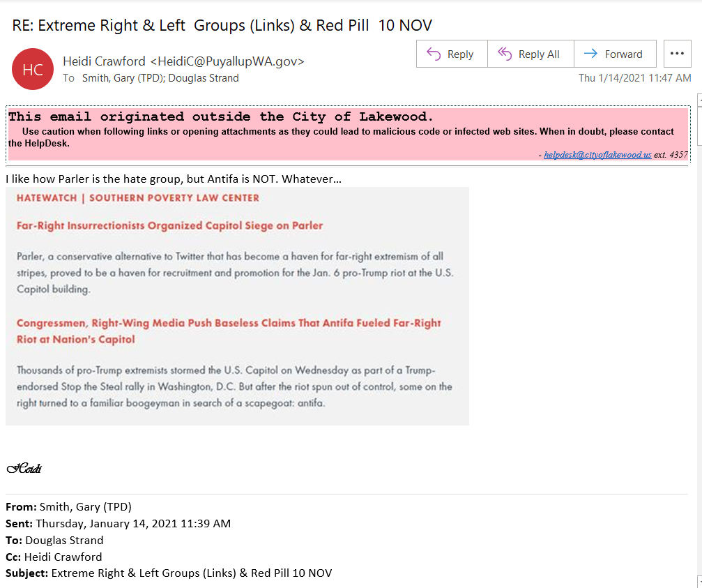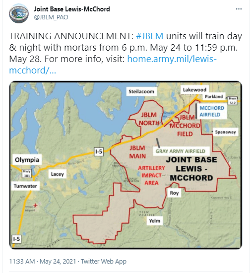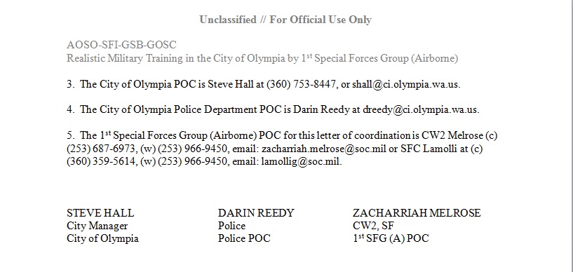 On May 6, Coffee Strong received a letter from the Lakewood city Planning Department, questioning the upcoming planned demonstration at I-5 exit 122 which had been advertised by Coffee Strong on their website. The letter had been coordinated with Lakewood PD Lt Mauer, who requested that his planning department “keep him in the loop.” They did. Later news stories listed Lt Mauer as the “Military Liason” for the Lakewood police.
