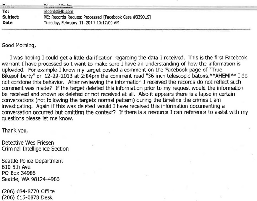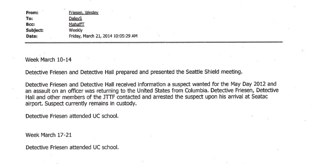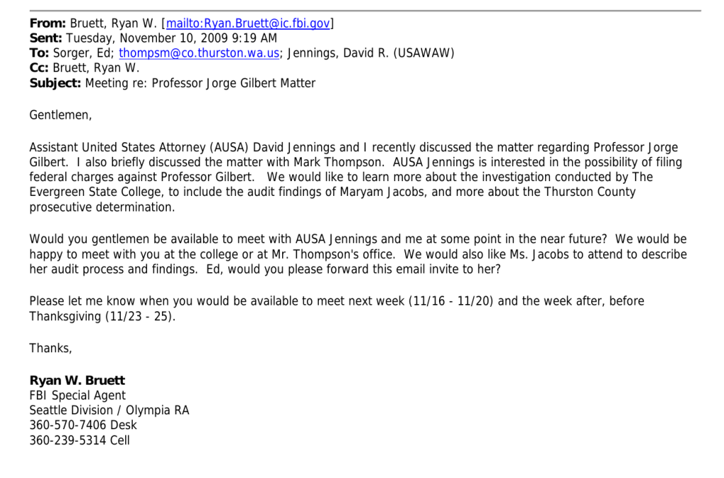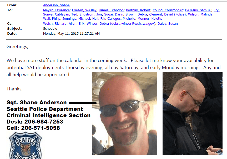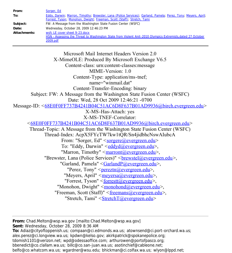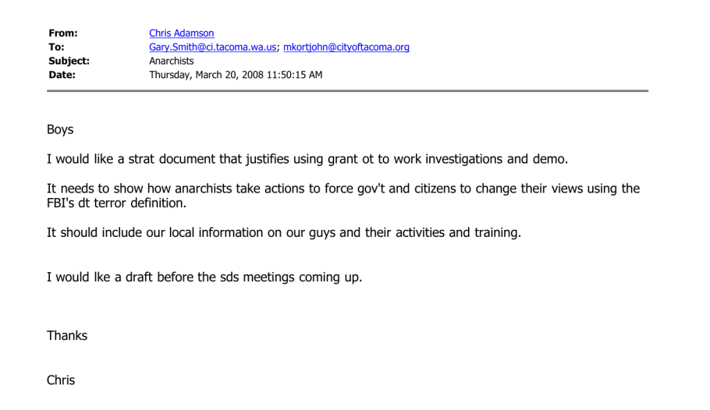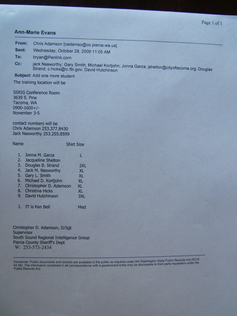 In January 2010, Brooke would file for a court order of no contact against Brendan Dunn, another SDS organizer at TESC, and her former boyfriend. Brendan was the organizer who in February 2009 had requested OPD’s emails and documents relating to SDS, Anarchists, and PMR participants – a document set which eventually revealed the email that gave us John Towery’s role in local spying for the US Army.