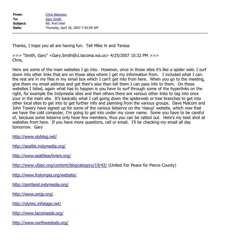 It was shortly after the first March 2007 Tacoma PMR actions that the attorney-client Oly22 list was sent a spreadsheet of all the persons on the prospective Jury Pool for that trial. This is normal procedure for attorneys and pro se defendants (persons who represent themselves in court) in a Jury trial, where preparation for Jury selection is coordinated with many people at once. What made this email distribution problematic was that several ex-defendants and some attorney’s investigators were also on the email list, and they were arguably not allowed to see the jury pool list. An email was sent out shortly afterward, advising several people in the non-defendant, non-pro se categories to ignore and delete the email unread. But US Army spy John Towery was also on the email list at that time, and he likely saw the emails and saved them for later use at trial. This would only come to light a week later, during the trial itself. It was not brought to the court’s attention directly by John Towery, who wanted to infiltrate the group in person and still needed to cover his participation in spying on us, so he passed on the information to Thurston County Deputy Michael Hirte, who established his own account on the (suddenly) unsecured Oly22 email list, which was hosted at Riseup.net. Hirte then approached the Court in open session and revealed the leak of the list to the Judge, who declared a mistrial in the case. The case was not heard again, and none of the persons involved in the mistrial in March 2007 were ever convicted of anything regarding the May 2006 protests. Some others had already accepted plea deals.