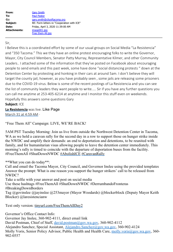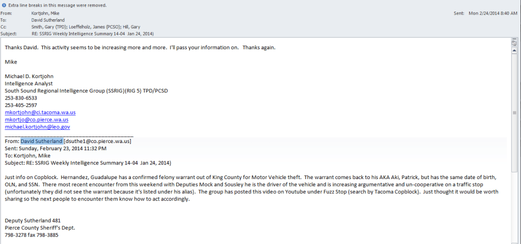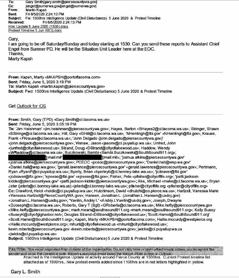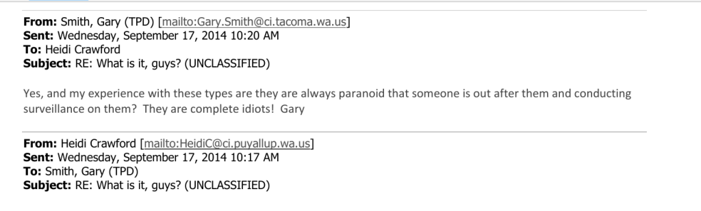 The bickering went back and forth, and only later did we realize that an email subscribed to the list at the time (jaamt004@gmail.com) was a military spy. We know this now, since the person using this email address got on our email lists before Tacoma Police believed there would be any serious possibility of protests. We also know it because it is included in some military emails we got much later in discovery.