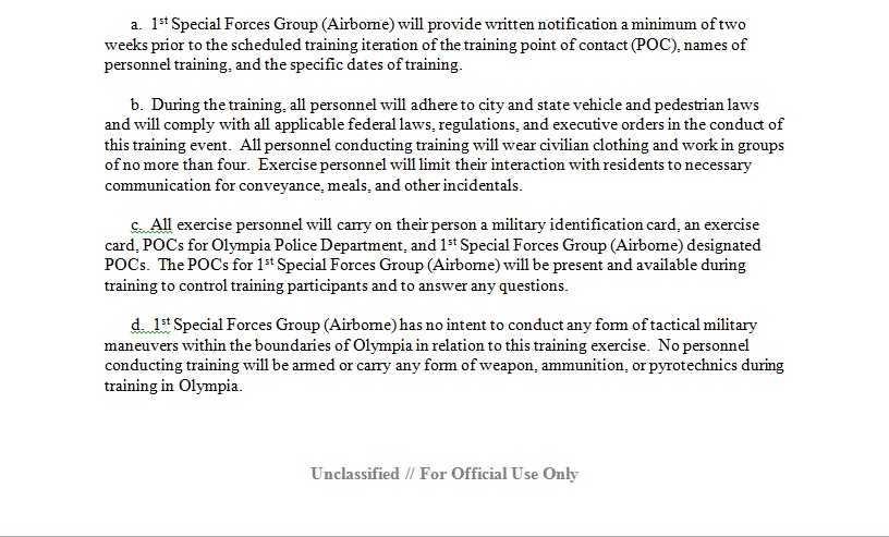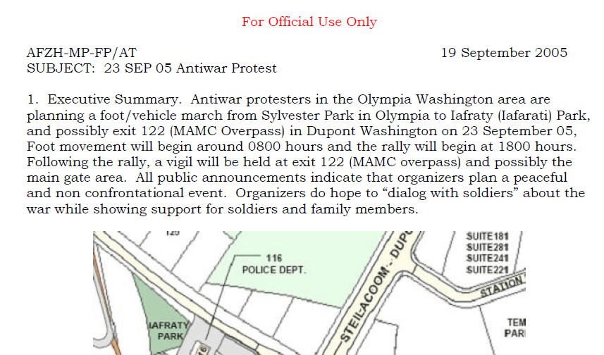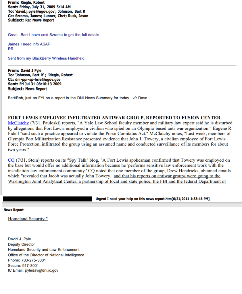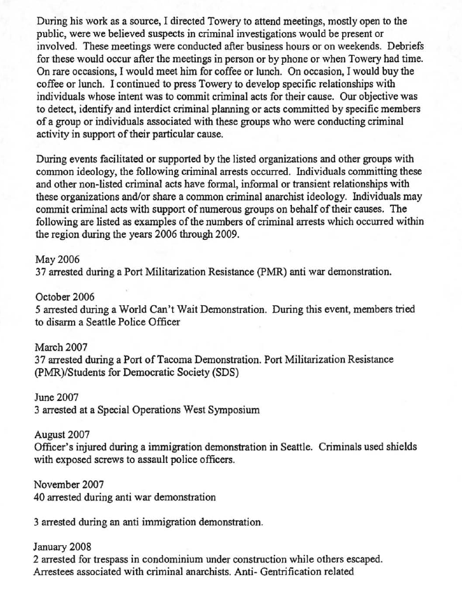 (In early December, 2010 the US Attorney handling the lawsuit against the Force Protection unit at Fort Lewis accepted that John Towery had been acting as an agent of the US Government and agreed to defend him in the court case, after the Associated Press discovered and wrote about the March 2, 2009 “point paper” which mused about “military spying on protesters.” With this document, it is now clear that Ft Lewis’ commanders knew of Towery’s role as an infiltrator.)
