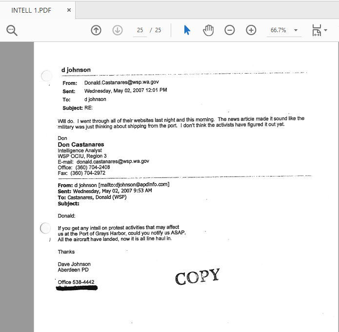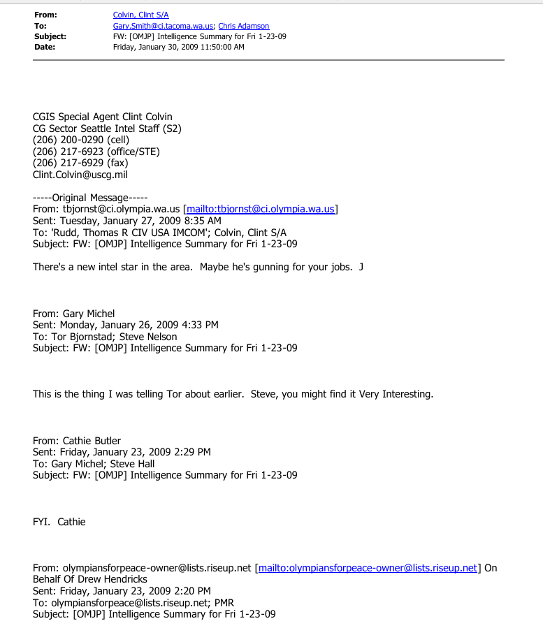 In mid-February 2007, US Army Force Protection Agent and DES employee, John J Towery signed up for the Oly22 listserv, and the OlyCivLib list which had been associated with the protests against the “Green Scare / Operation Backfire” cases. He was not noticed at the time. We now know that he was seeking insight into our reaction to the upcoming movement of US Military gear through the Port of Tacoma, which was coming up in March 2007. The next day (February 17th) Towery subscribed to the Olympia PMR listserv, and applied to subscribe to the Olympia Movement for Justice and Peace (OMJP) listserv as well. He told the administrator of the OMJP list that: