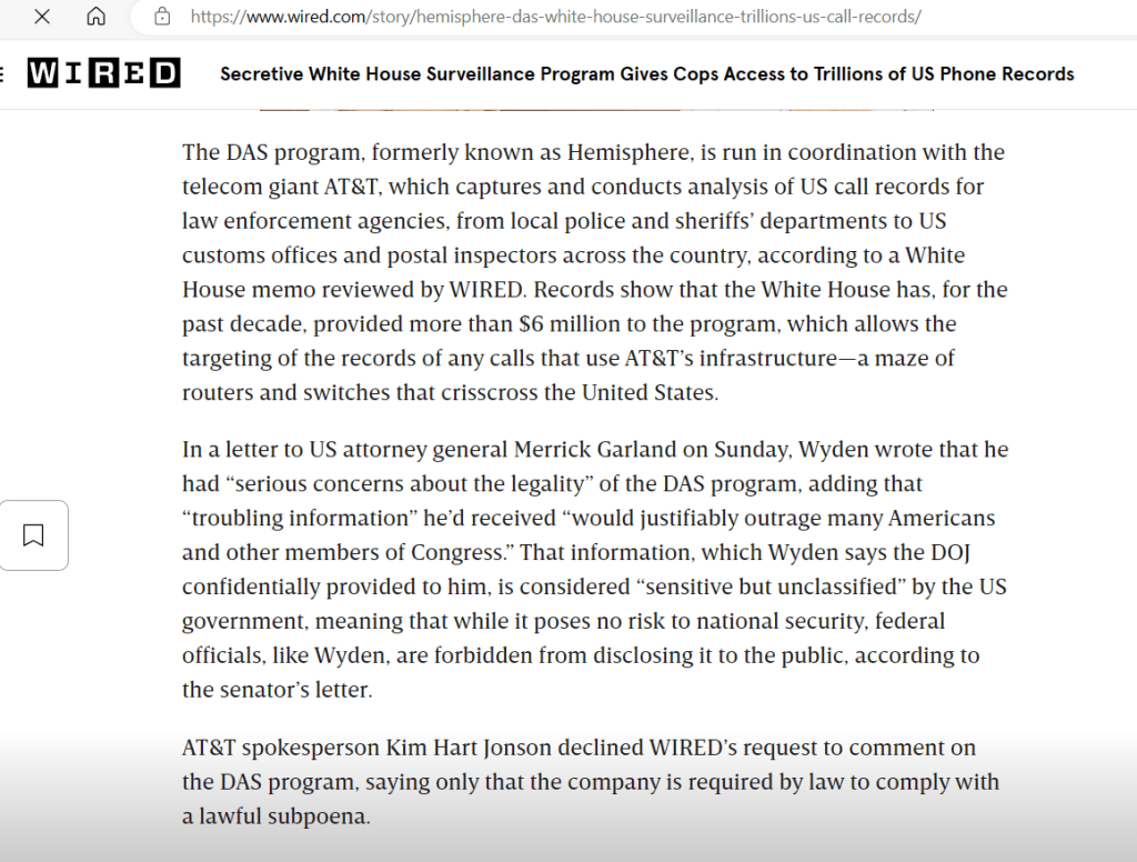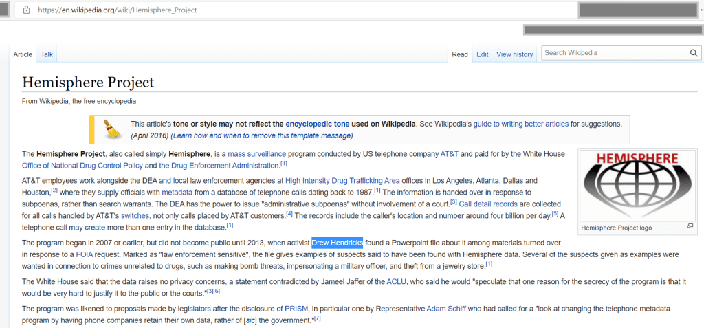 Hemisphere was a program name for an AT&T data mining operation that changed codenames and now is still a thing, totally for the same purposes and stuff, but with more judge lunches or some nonsense. Anyway I was interested when I read the manual on the program and it had several slides about Parallel Construction so…. I blogged it and a friend tipped the New York Times. So I made a story that made the Paper of (checks notes). Anyway, moving on. That was in 2013, so it was impressive for some circles for a minute or two back then.