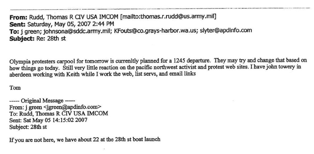 Over the next few days, several carloads of persons attempted (and three succeeded) to make human blockades at the entrances to Fort Lewis. Two teams, totaling five persons, were arrested before midnight on May Day, and one team of four persons was arrested the next night. Both Lakewood and Fort Lewis Police took part in the arrests. US Army Agent John Towery participated as an intelligence asset “for” PMR-INFO, two months after the Army had written about their worry on March 2nd that the mainstream corporate media might report that the military was “spying on protesters.” The Army had been warned of his participation by the revealed Tacoma Police emails, but the Army had not stopped him yet; he would not be named publicly by Olympia PMR until late July, 2009.