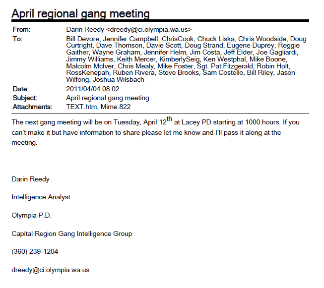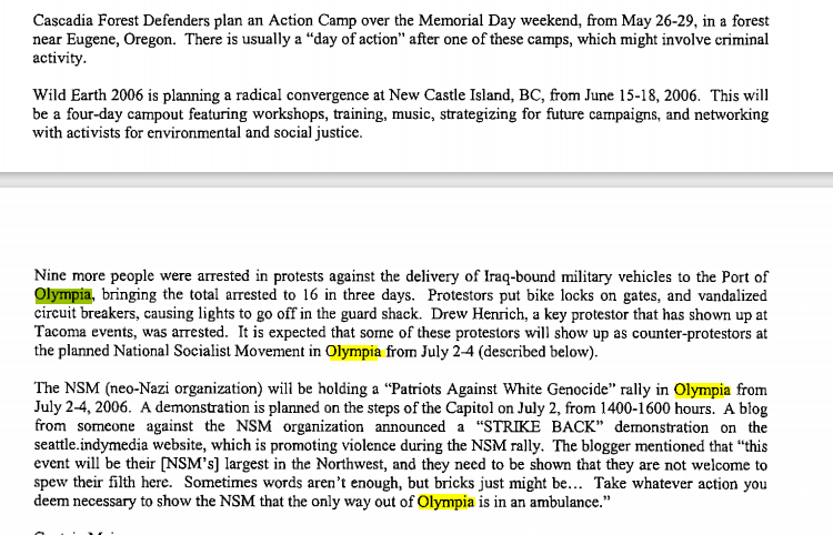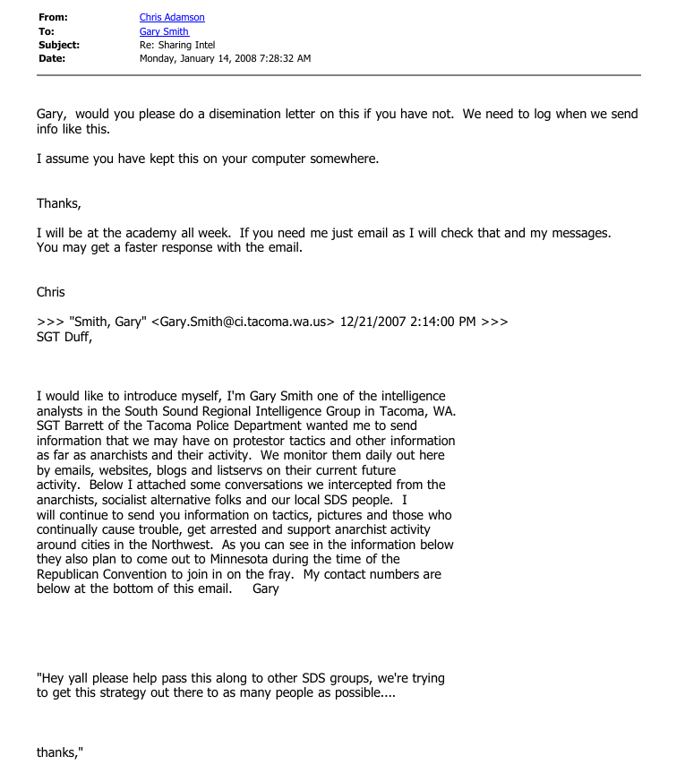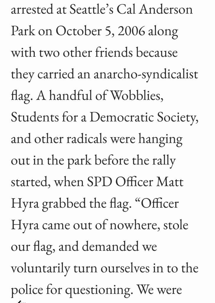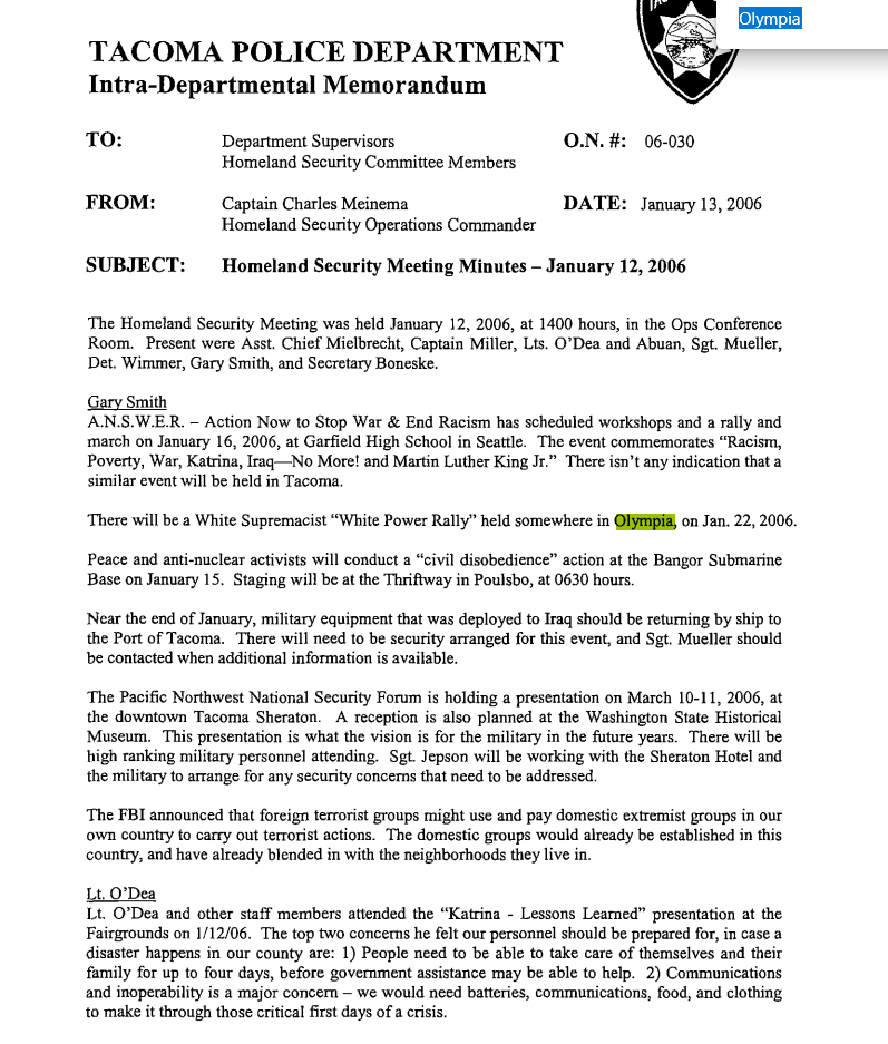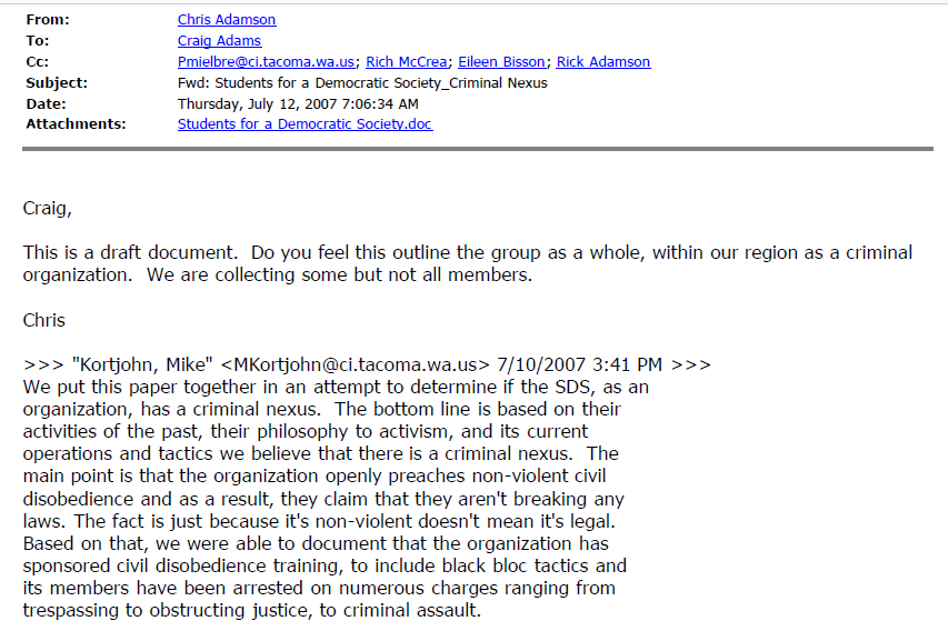 The day after the Oly22 listserv was created, three persons associated with it were arrested for being near an anarchist banner in a park in Seattle, by Seattle Police Officer Matthew Hyra. One of the three persons arrested was the originator of the listserv. The case was eventually dismissed in June of 2007, and a settlement for five figures was paid to each of the three defendants who were arrested. This case would later be cited by Pierce County RIG 5 Analyst Mike Kortjohn as “evidence” that the SDS members arrested in Seattle linked SDS as a regional organization to a “criminal nexus.” It was this criminal nexus that would “justify” much of the regional law enforcement spying against PMR and SDS for the next three years.