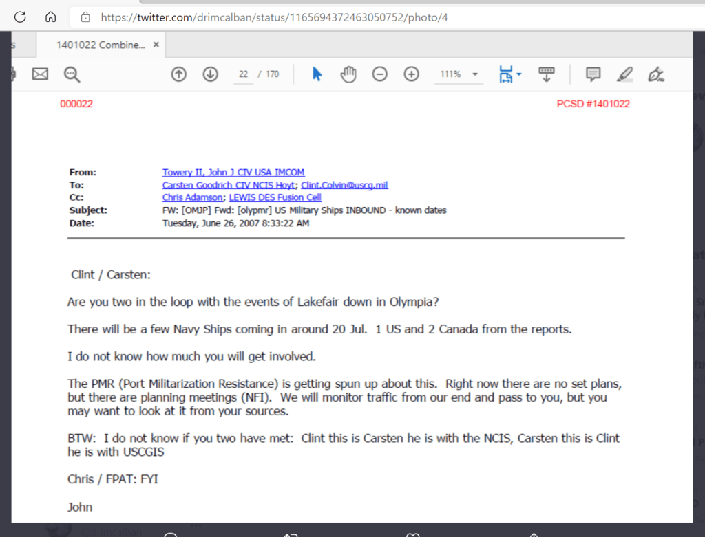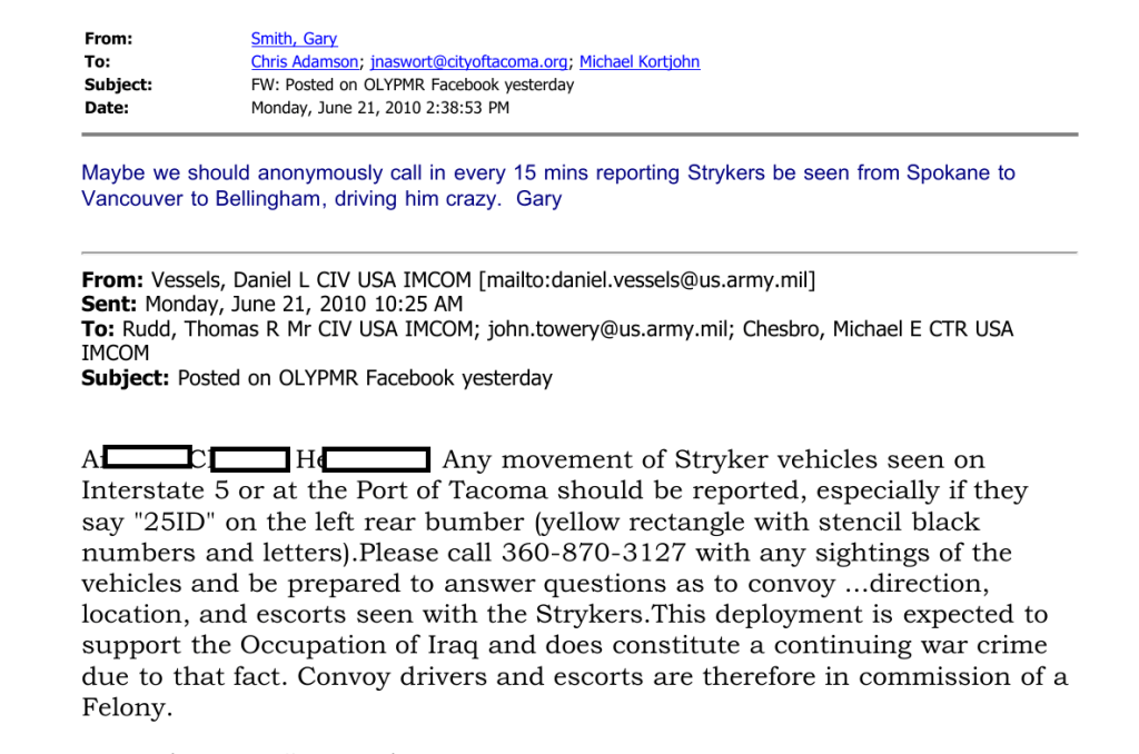 But first we should review some of what the JBLM Task Force was up to within their own network: Prelude to Port Militarization Resistance, and Situation Normal for Olympia as a Base Suburb.