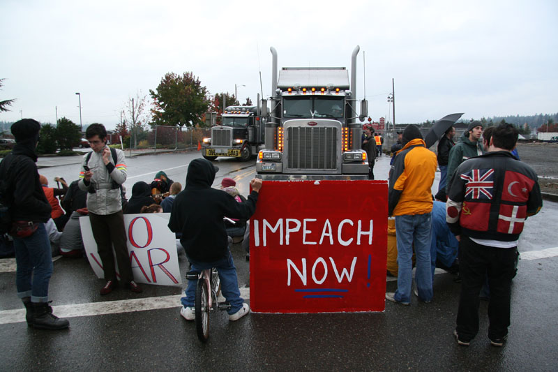 As the 2009 May Day “Hoe-Down” at South Puget Sound Community College was getting underway May 1st, observers stationed on Interstate 5 confirmed at 8PM that Fort Lewis was sending convoys out to the Port of Tacoma just as PMR-INFO had predicted. I almost immediately issued an alert, which is an advisory to begin to take up actions in small affinity groups and go out to resist the war. In response, the convoys stopped after just three hours of operations that night.