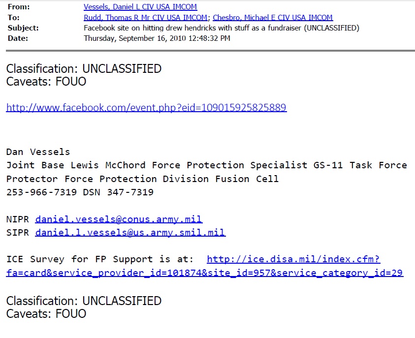 On March 27, 2009 at 7:41AM “PMR-INFO Tacoma” posted to Seattle IMC speculating that the 5/2 SBCT might fly to Afghanistan, citing a DOD story which had been specially constructed to convince us that it was a real news story about the shipment. PMR-INFO Olympia later disclaimed this post (and disagreed with it in the site comments). This turned out to be John Jacob Towery’s post (to Seattle IMC) and he later admitted to posting the story in a phone conversation he had with Drew Hendricks. This action began the investigation which would eventually out Towery as a US Army spy.