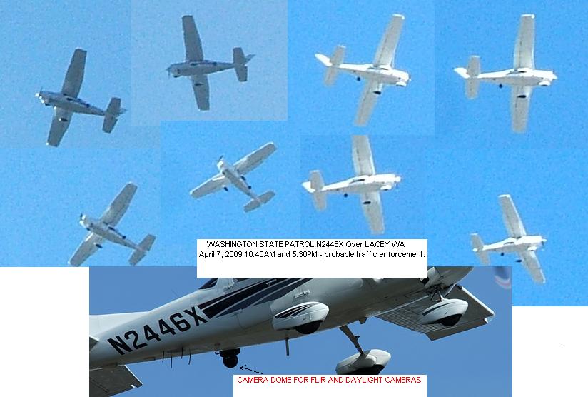 On April 7th, 2009 I (Drew Hendricks) woke up at my friend’s house and turned on my phone to get messages and coordinate work with my boss. I almost immediately noticed that the Washington State Patrol Cessna was flying a beeline to my location and pointed out the aircraft to my surprised friend. The plane then ran in circles over the apartment house, so I took several photographs of it and later published them online.