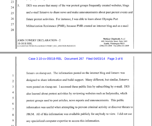 (In early December, 2010 the US Attorney handling the lawsuit against the Force Protection unit at Fort Lewis accepted that John Towery had been acting as an agent of the US Government and agreed to defend him in the court case, after the Associated Press discovered and wrote about the March 2, 2009 “point paper” which mused about “military spying on protesters.” With this document, it is now clear that Ft Lewis’ commanders knew of Towery’s role as an infiltrator.)