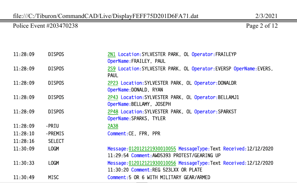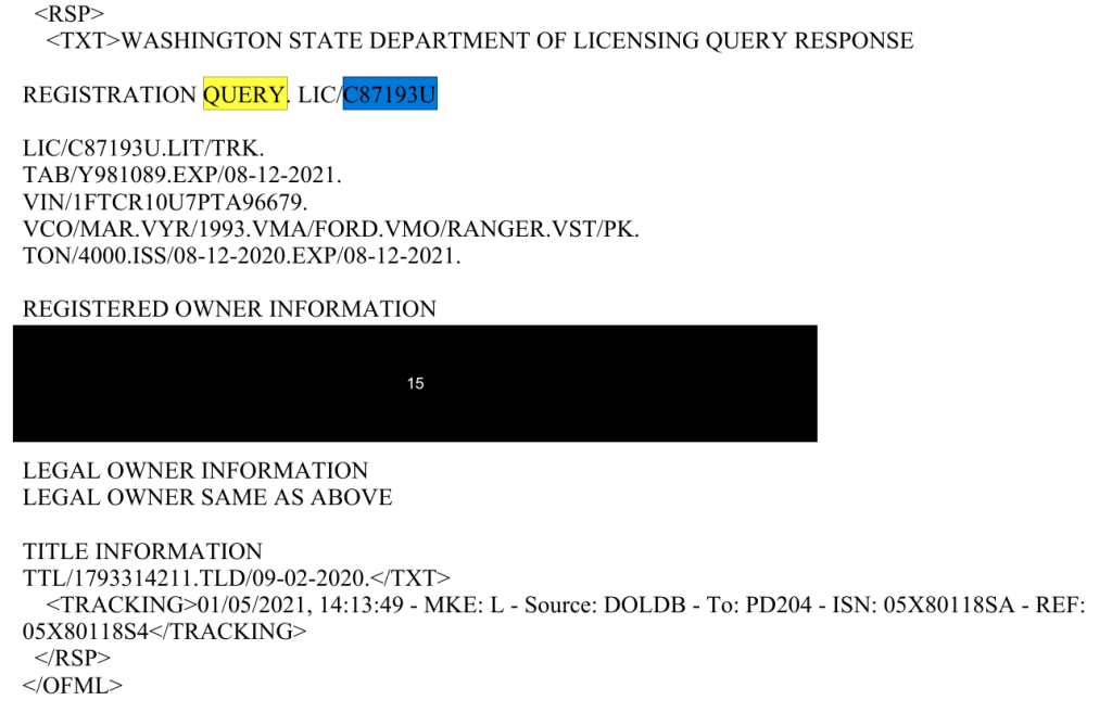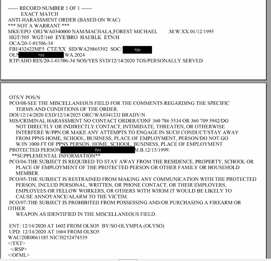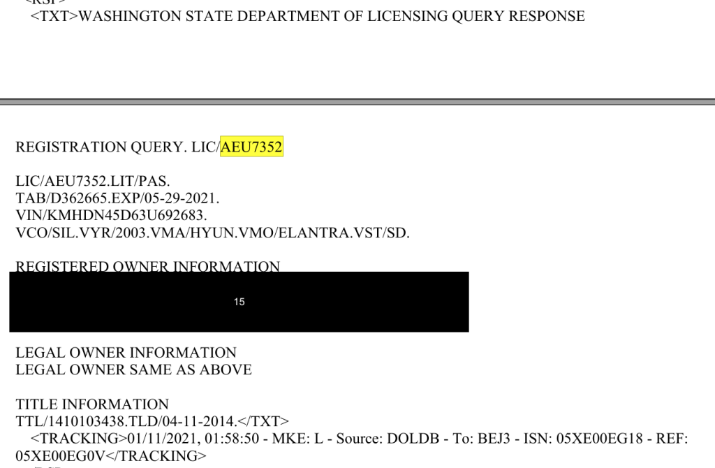 Profiles in motion outside the GA HQ on Olympia Capitol Campus Dec 12 2020OSINT Collected from TWITTER via FB scrapingACCESS peers into near spaceACCESS logs tells us about who was run, when, and why, by whom. How is known, it’s the fulcrum.Not all telescopes see all data in a source. PRA does not get Addresses from DOL.But if we want the whole list of who Thurston County ran the day of, we generalize out to a wider viewC87193U was run by each of these separate entities in 2020 – 21Detail of one of the searches aboveA name pops out of the data in the middleWhen the name is run redaction works differently than when the plate is runEvery plate that day not just the ones involved but ALL of themAll the names run that day – not just involved but ALL of themLater on an FBI Extreme Protection Order is put togetherArrest is effectedArrestSHARK and case numberCase Number