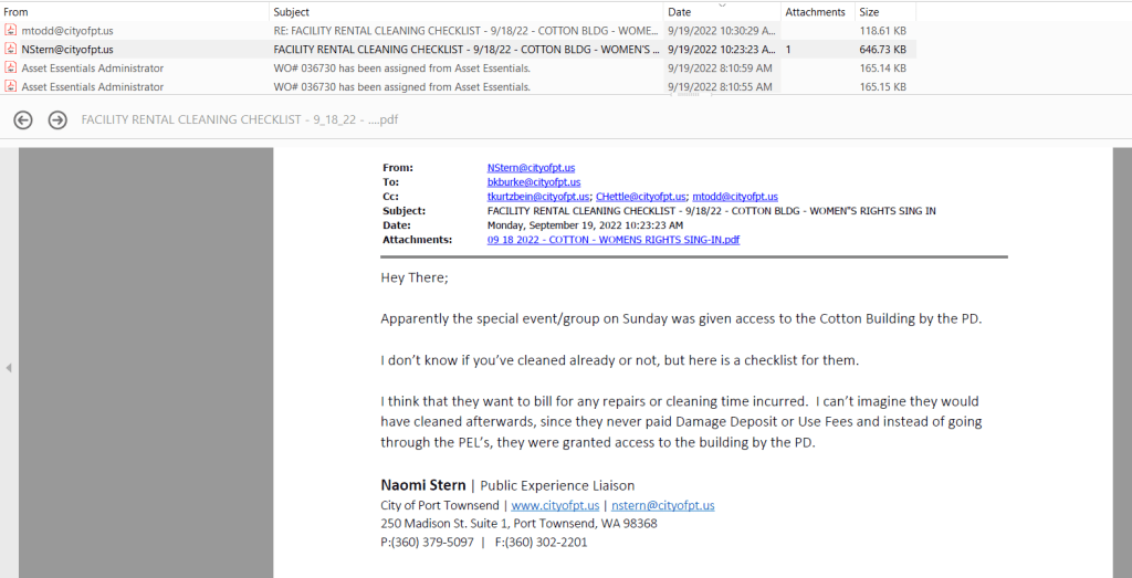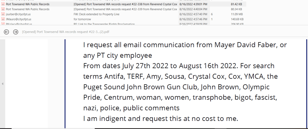 A long time Port Townsend resident lurked in the showers at the YMCA in town and began demanding loudly to be told about the genitals of a child care worker who was watching her charges, late in July 2022. The child care worker’s co-workers told the woman she was no longer welcome to be at the pool because of her harassment and the upset she caused the children and the staff at the facility, which is contracted with the City for about $130,000 a year. PT Police were called but arrived after the unwanted party had self removed for the moment.