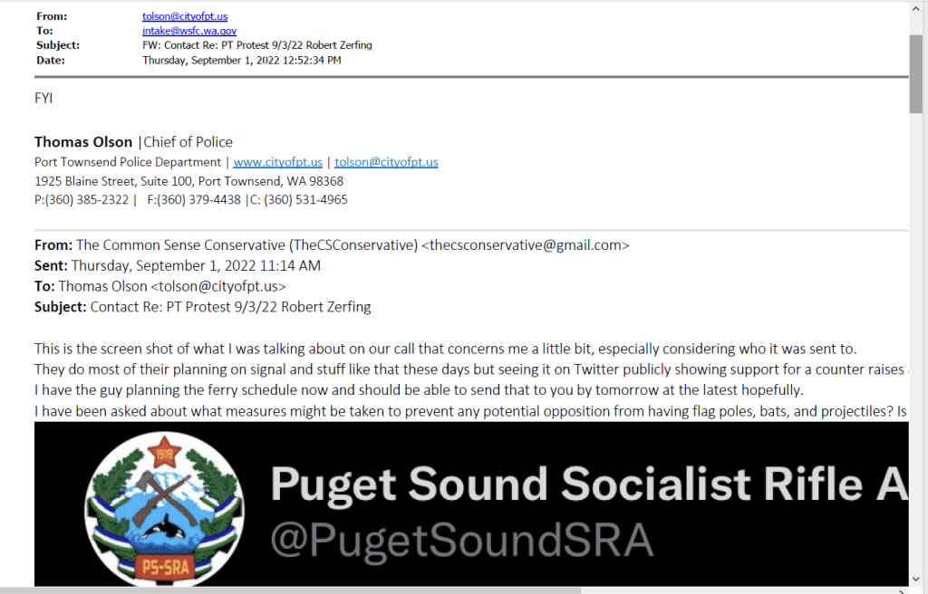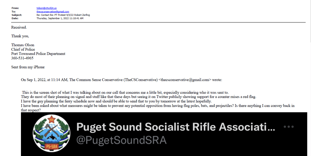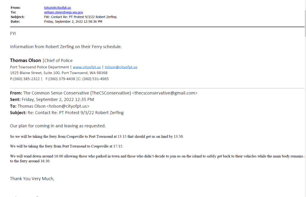 A couple of weeks later Robert Zerfing and his co-organizer Erik Rohde arrived in Port Townsend with a full County, State Police, US Coast Guard, and Port Townsend Police escort and spent an hour in his Protest Pen with the only Camera Pole allowed in his privatized space. Police Reports ensued.