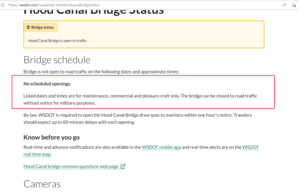 Hood Canal has a ship that carries a highway across it, and the crew of that ship must coordinate with the Navy from time to time, and run a Social Media suite on the Hellsite, on Text to phone, on Email to Device, etc. On these social suites, the various announcements of closure and plans for closure are made, relative to the vehicle traffic across the ship – which must open the Highway to allow Navy Escorts and Submersibles to pass through the gap thus restored. One can browse a website for those announcements or subscribe to them, if one is willing to understand that they will purge the list and you must resubscribe often.