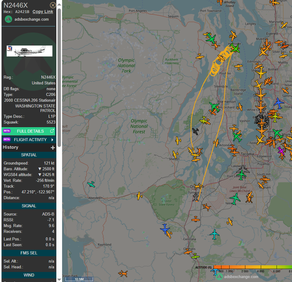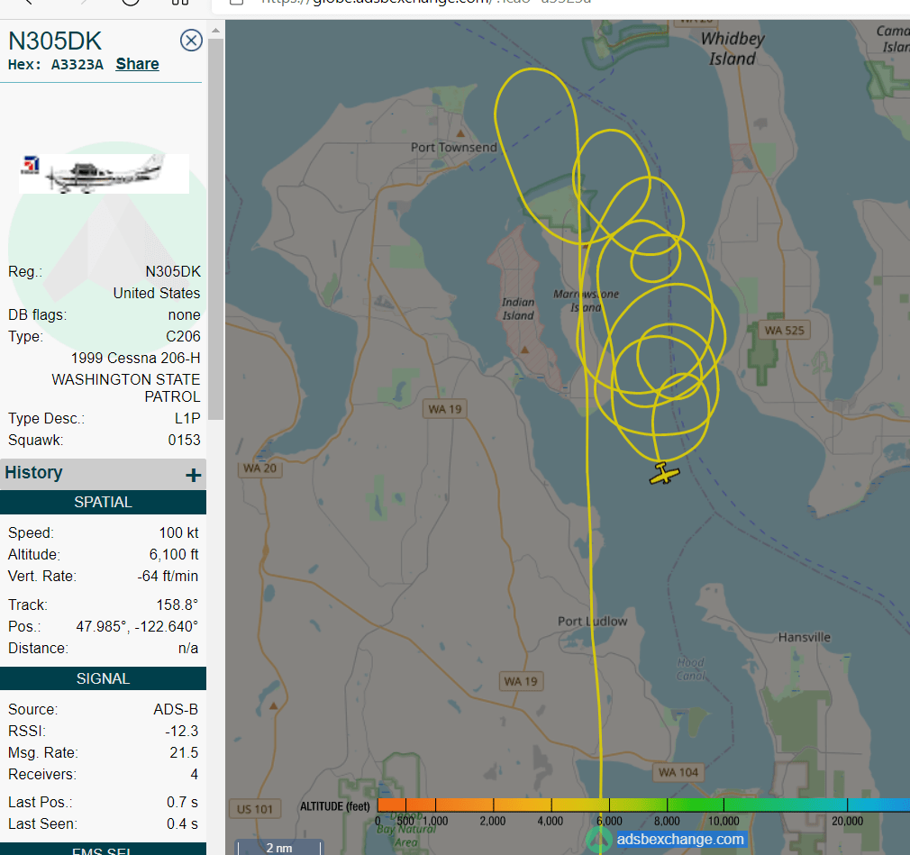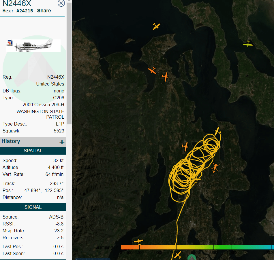 ADS-B is a commonly used radio system in the Air to avoid space and time conflicts between flying platforms in the Skies above the Sound. This can often be used to track whether the State Patrol’s platforms are snaking coils above the Coyle or looping snooping over the Peninsula Kitsap.