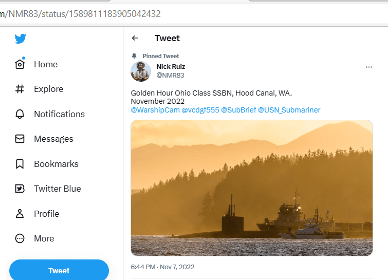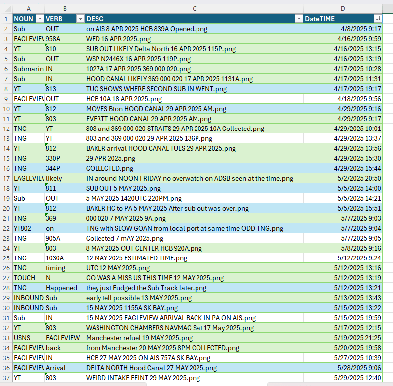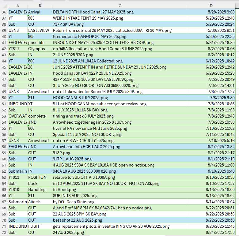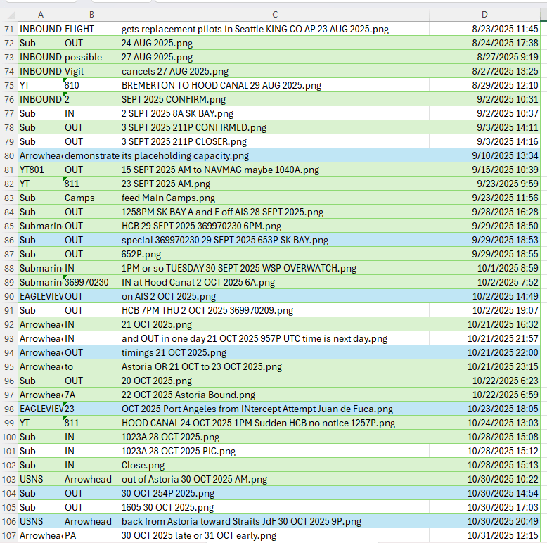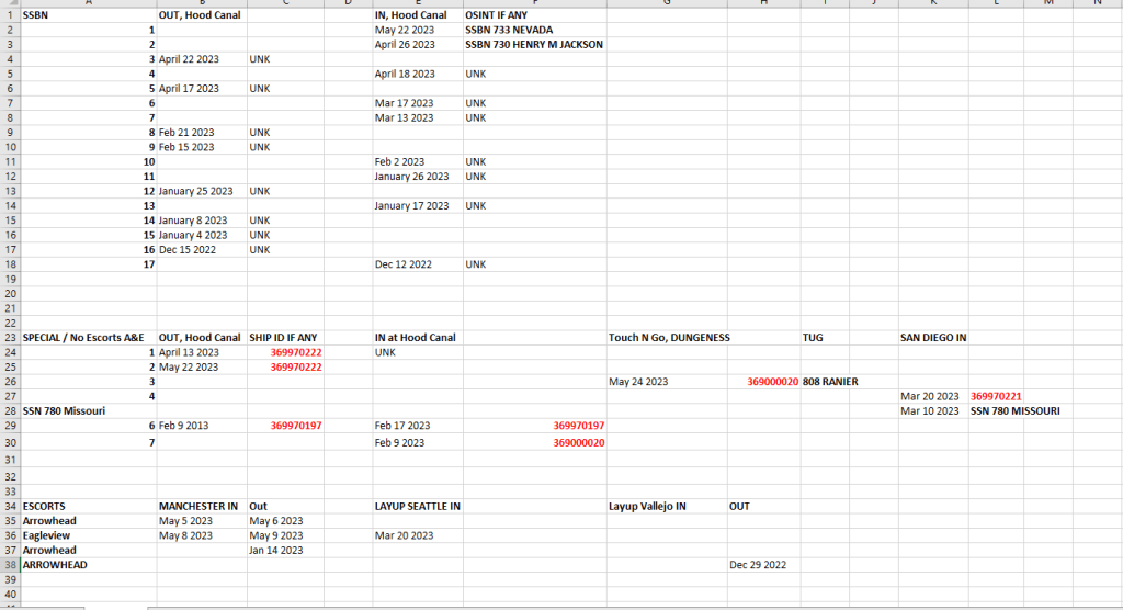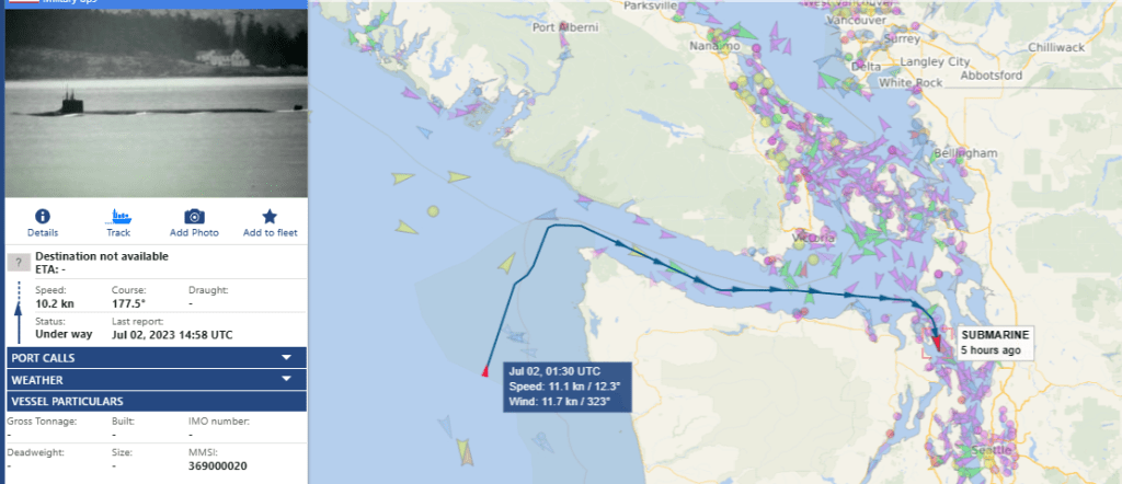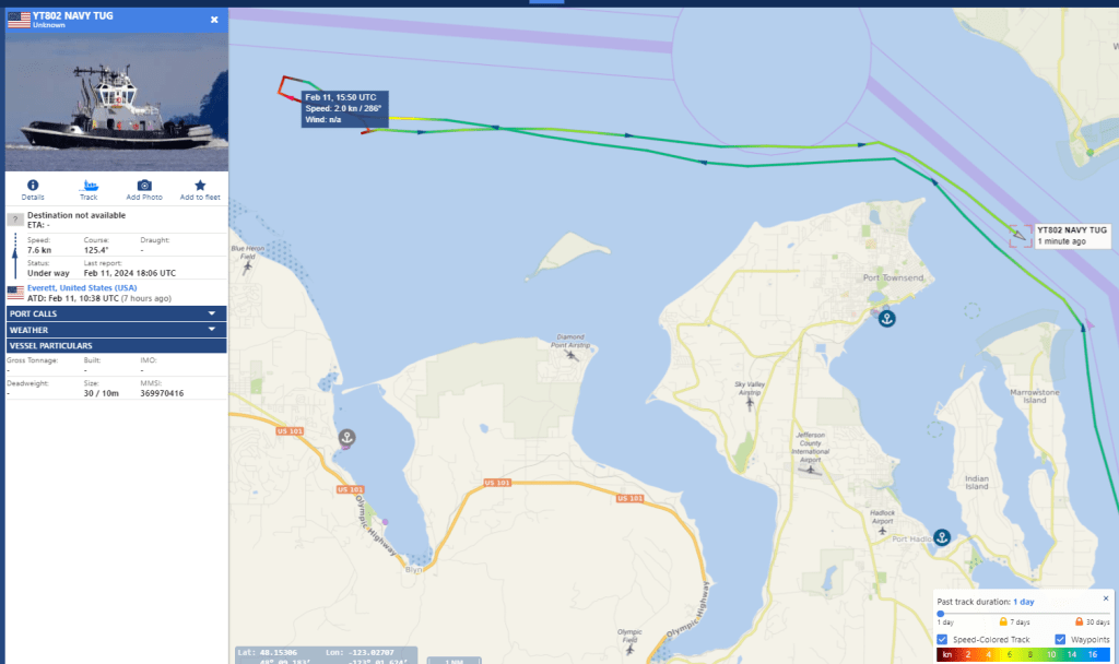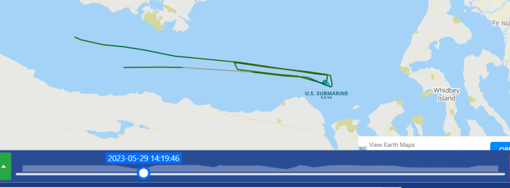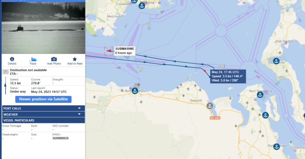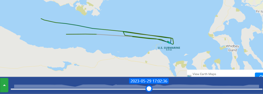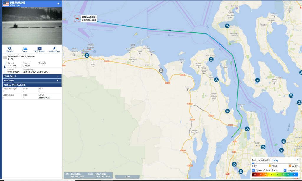 AIS is a commonly used radio system at Sea to avoid space and time conflicts between vessels plying the restricted waters of the often foggy Sound, and its Straits. This can often be used to surmise when Tugs, Escorts, and Security vessels are in motion at key points in their journey, when fate is not relied upon for navigation and sound is not enough to peer through the fog. Submersible Boomers hardly ever touch the stuff, perhaps they cannot – I never recall seeing it happen. But special submersibles that often go without escort or with extremely limited numbers of escorts often use it to avoid being hit in the channel by larger, faster traffic.