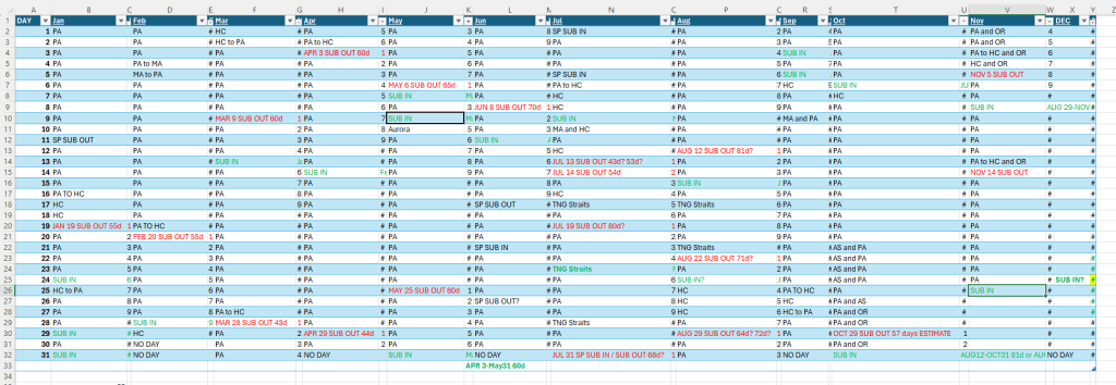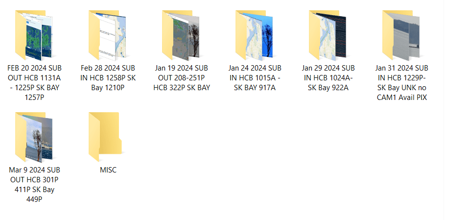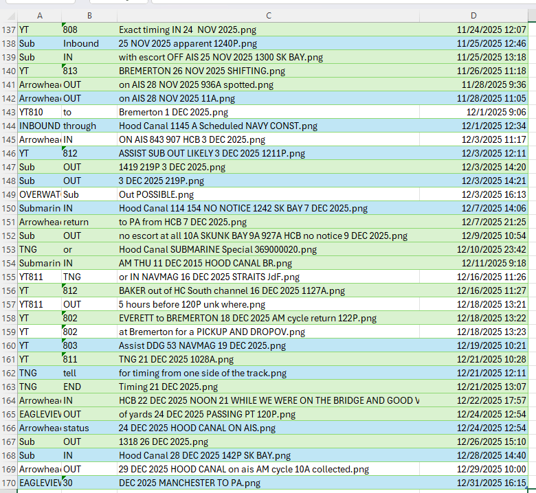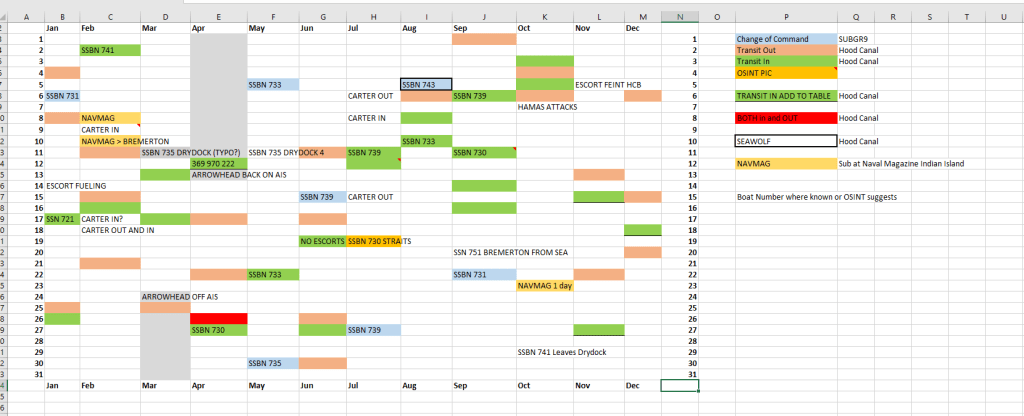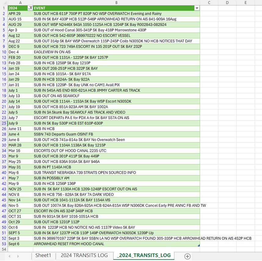 Between the various sources of clues about when a transit is happening and the tendency of public photography to emerge in the fullness of time, it is possible to put together a public sourced list of when the limited number of submersible vessels has transited.
