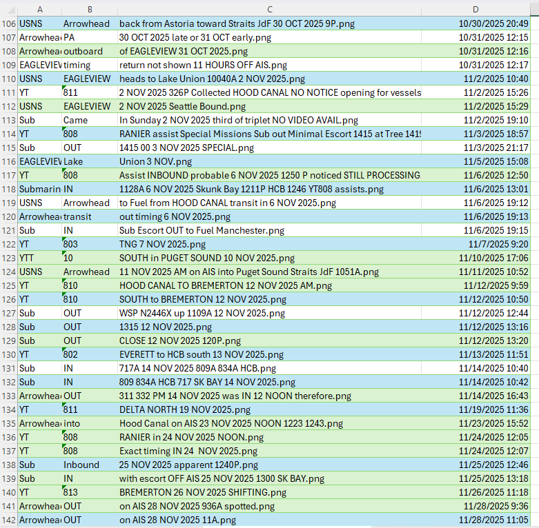 Next day, Escorts both move into Hood Canal – one of them extinguishing AIS signals while still in the Straits. The other, at the Delta Pier.