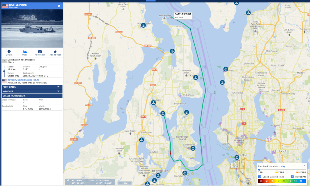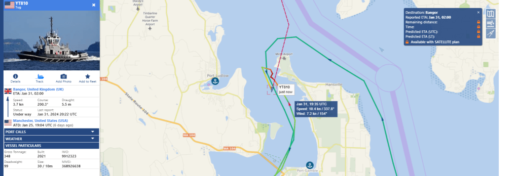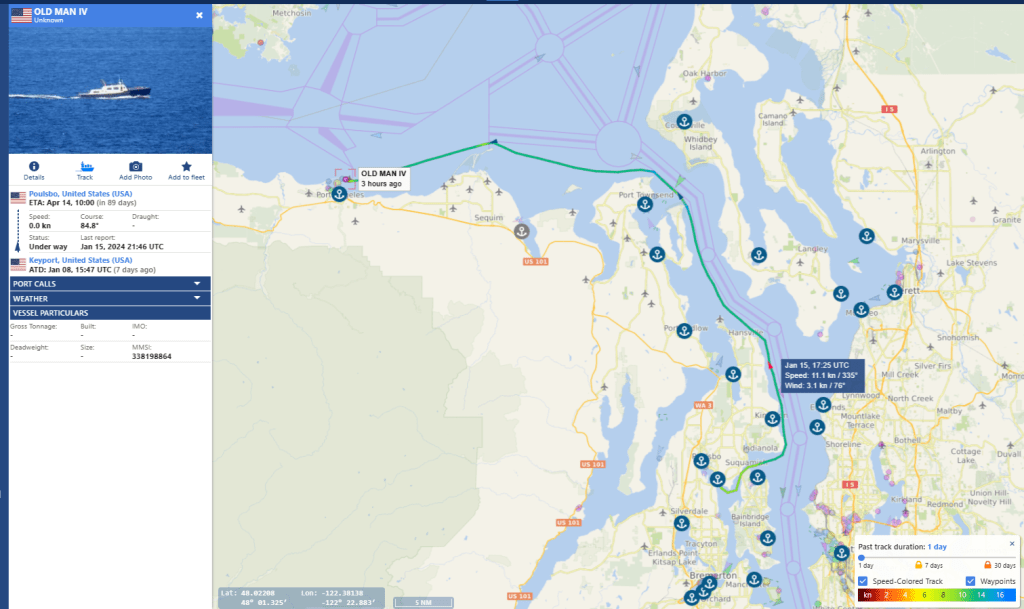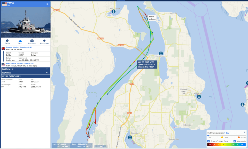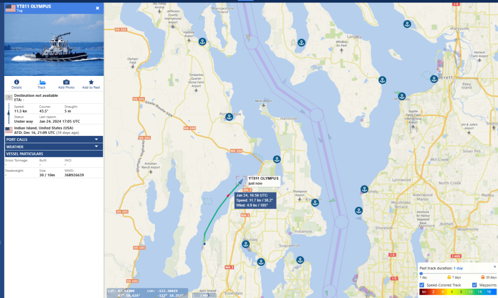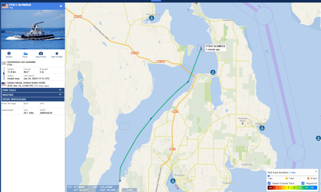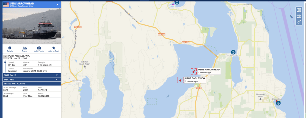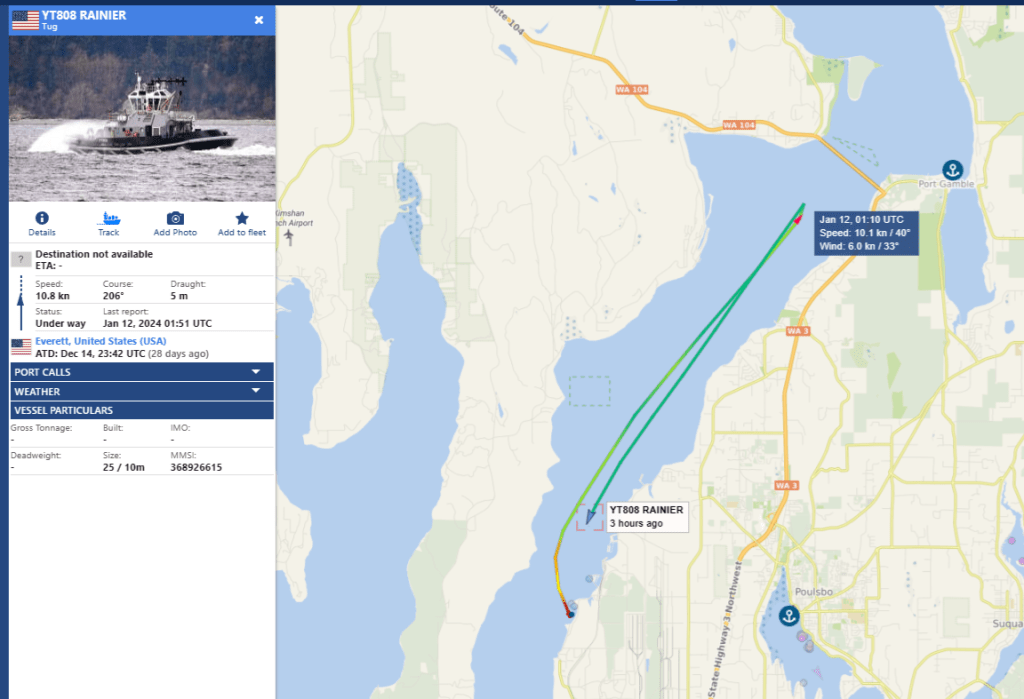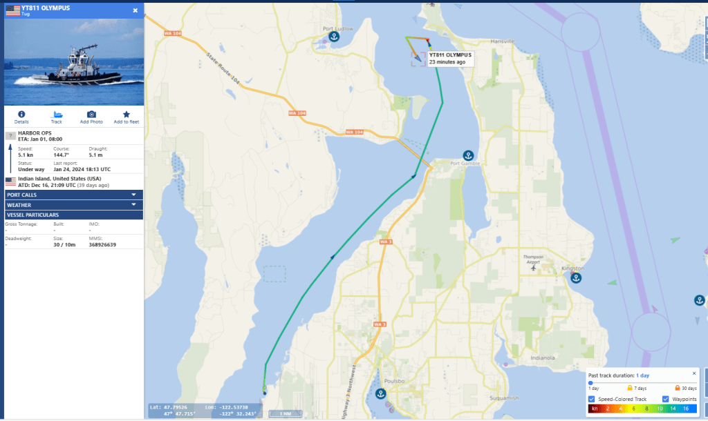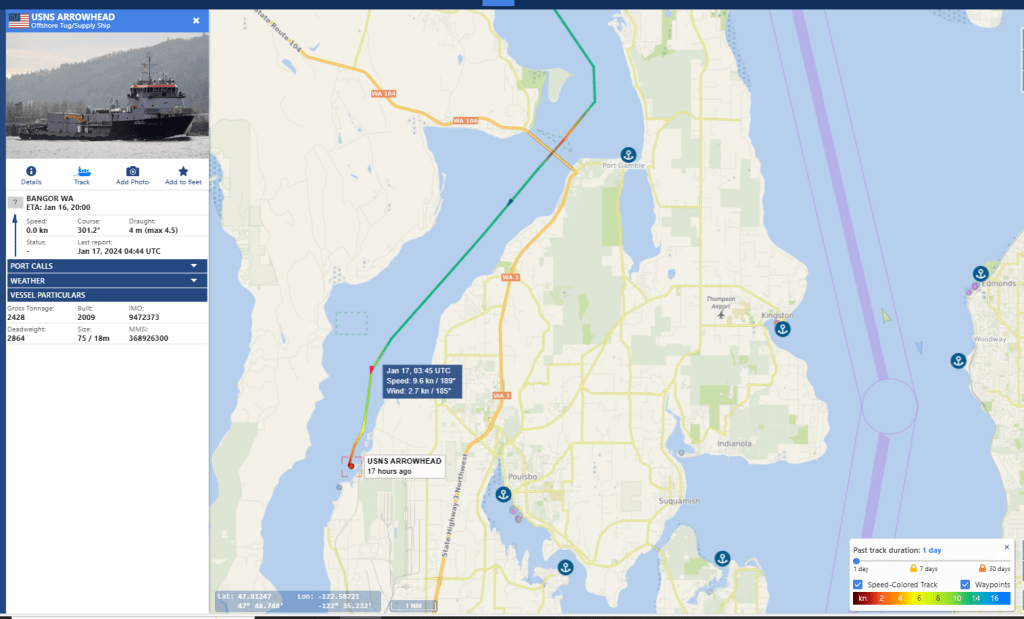 Friday January 19th 2024 the two escorts emerge with a Boomer, from Hood Canal at 208P-251P and at Skunk Bay by 3:22P